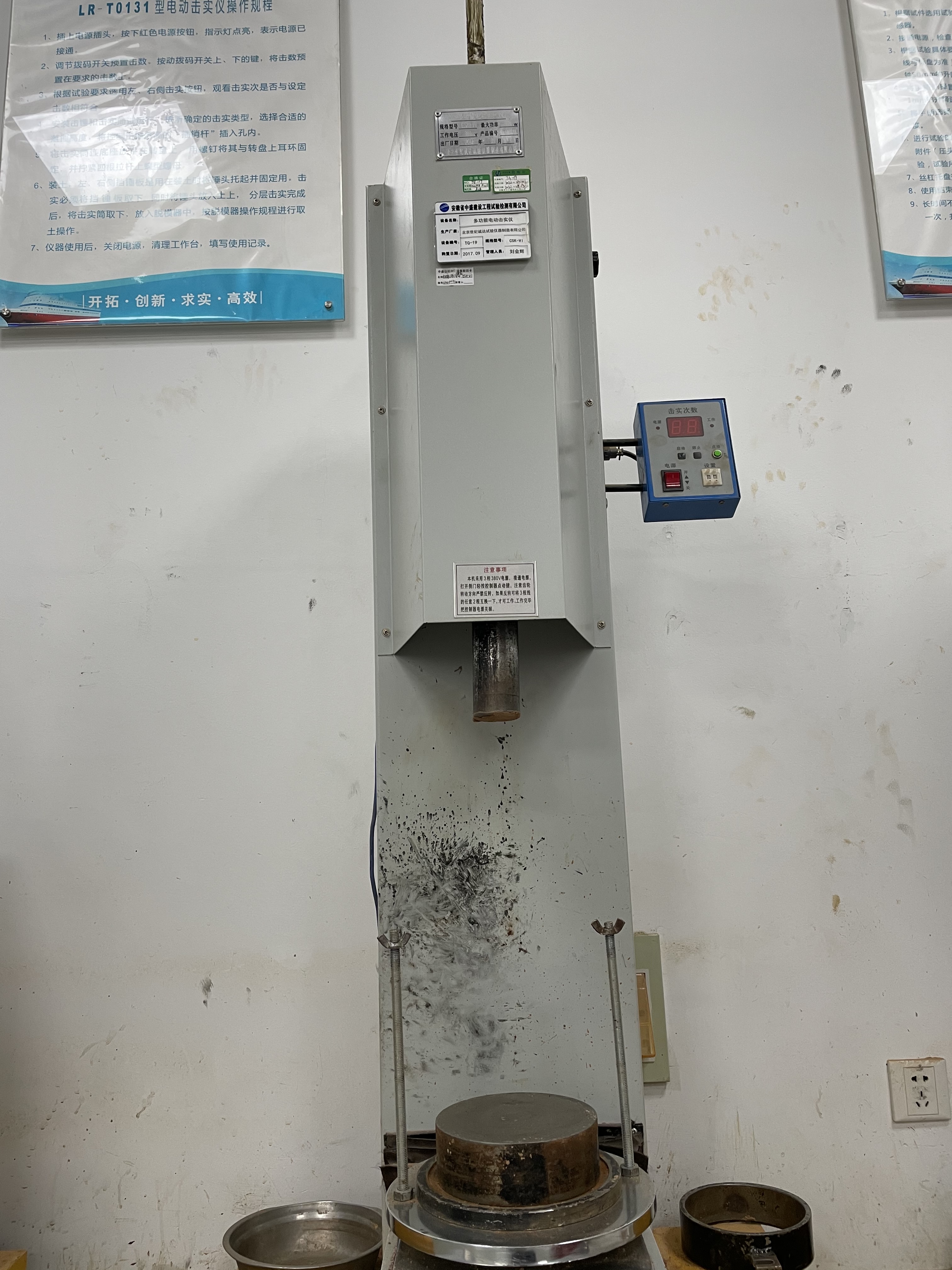 安徽省中盛建设工程试验检测有限公司仪器设备管理信息设备名称多功能电动击实仪(液晶式)规格型号CSK-VI量程/精度/唯一性编号TG-19生产厂家北京世纪诚达试验仪器制造有限公司出厂编号170811购置日期2017.09价格(元)5500检定/校准单位/溯源方式/检定/校准日期/有效期/修正因子/所属功能室土工一室状态标...