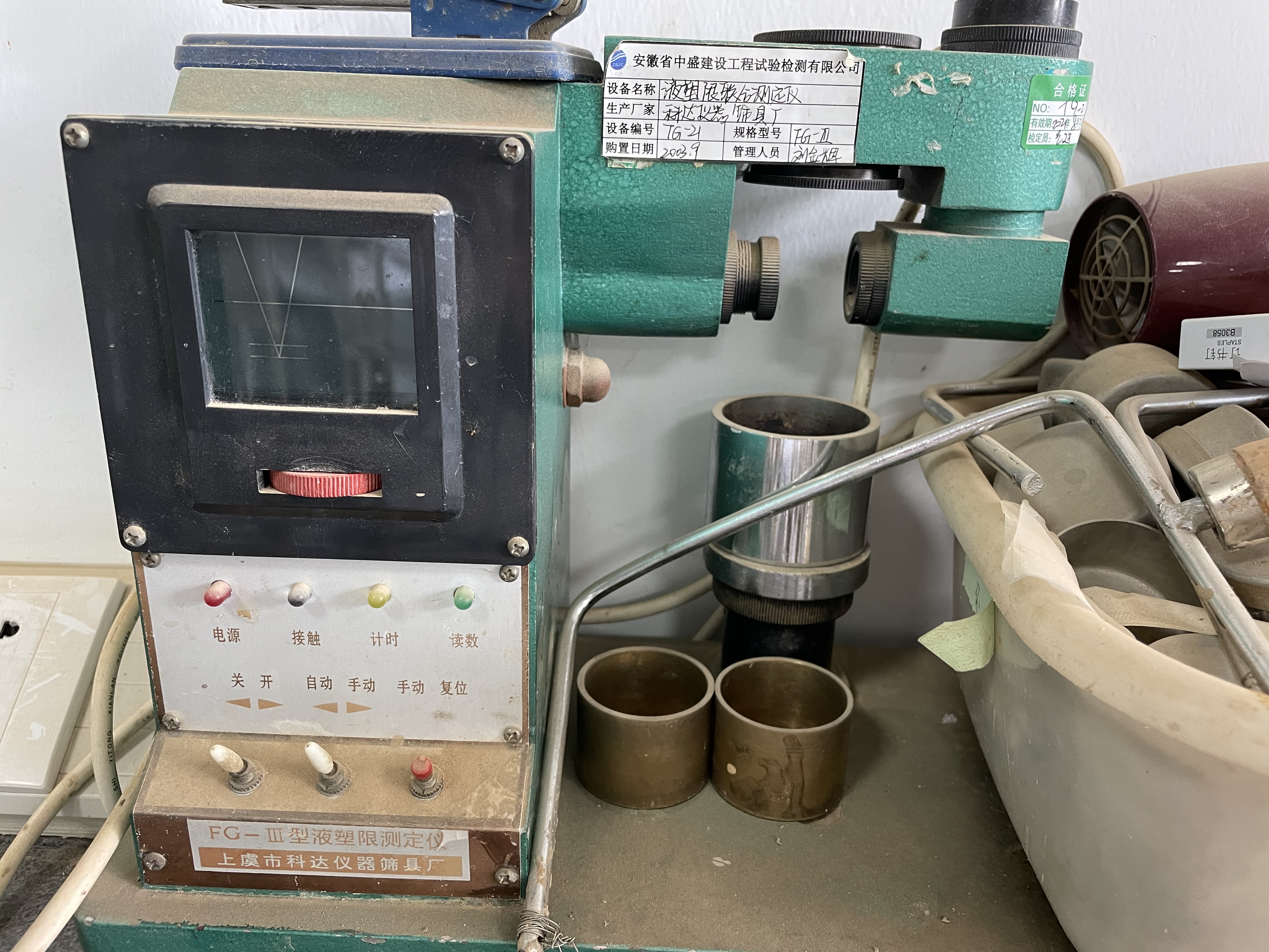 设备名称液塑限联合测定仪规格型号FG-Ⅲ量程/精度/唯一性编号TG-21生产厂家科达仪器筛具厂出厂编号99215购置日期2003.9价格(元)2400.00检定/校准单位钧准检测科技有限公司溯源方式校准检定/校准日期2023.8.3有效期2024.8.2修正因子/所属功能室土工一室状态标识在用保管人曹蓉